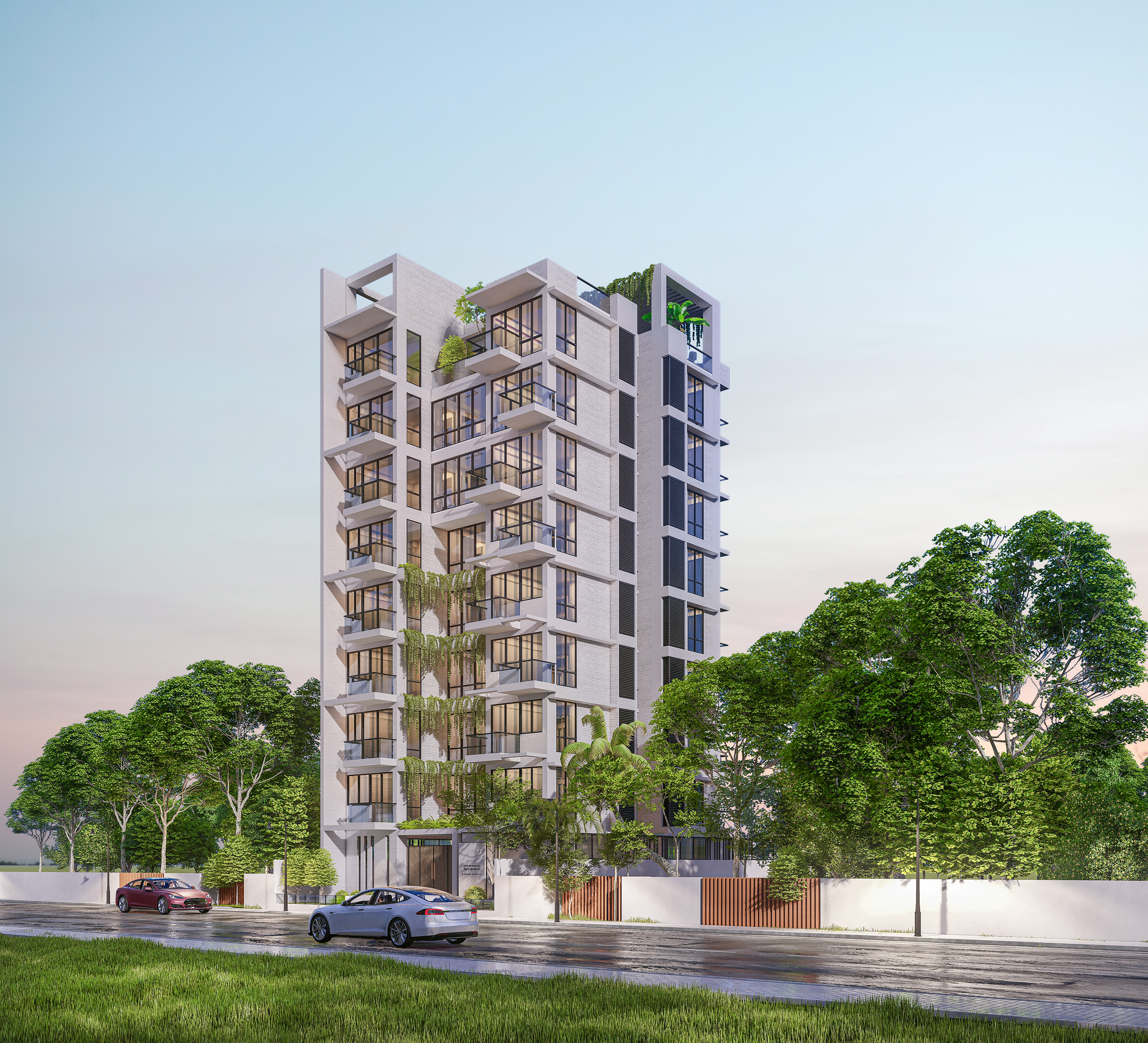South Vista stands on a corner plot in Bashundhara, surrounded by amenities yet offering a calm residential atmosphere. The design explores openness and tranquility through its rhythmic façade, layered balconies, and green inserts that connect nature with urban living.